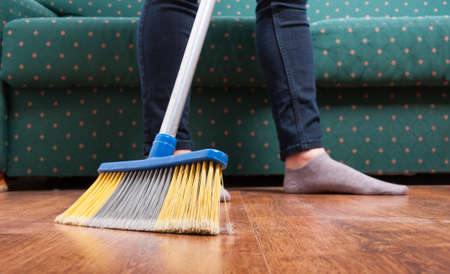 Sweep the floor with a brush. Indoor cleaning close-up.