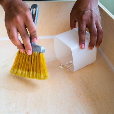Close-up shot of hand holding a broom, Scooping rubbish into the dustpan, Cleaning scraps of paper on a wooden floor, Scouring, Broom and dustpan, Big cleaning concept.