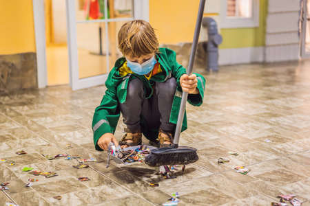 A boy in a working uniform and a medical mask sweeps the floor.