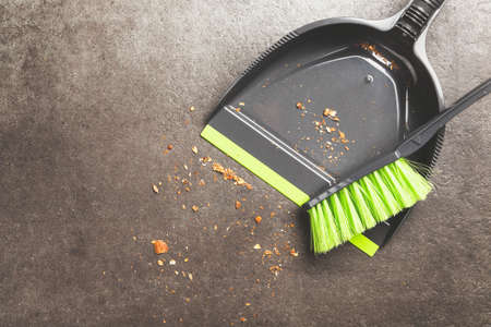 Cleaning and home concept. Sweeping brush small whisk broom and dustpan for house work with garbage on floor indoors.