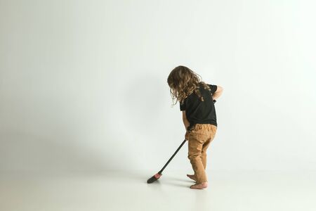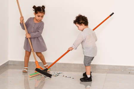 After party. Little curls boy and beautiful girl sweeping confetti with brooms. Brother and sister cleaning floor in a home with mops. Children cleaning the living room together.