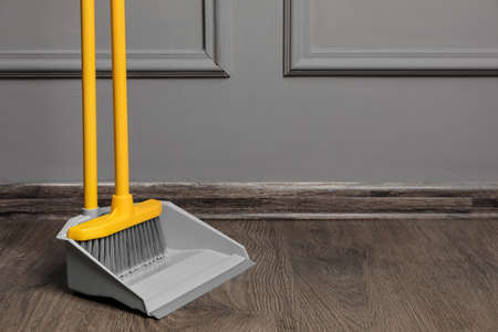 Broom brush and dustpan on the floor. Home cleaning.