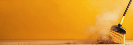 A broom sweeps across the ground, stirring up dust and creating a cloud against a bright orange backdrop, highlighting the cleaning activity and the dynamic movement of the brush.