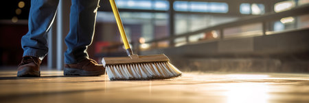 A person in work boots uses a broom to clean dust and debris in a construction area, illustrating manual work and the importance of cleanliness in a work environment.