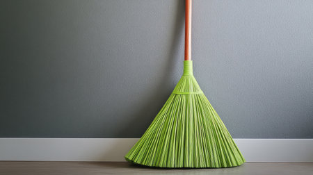 A vibrant green broom stands against a grey wall, showcasing a stylish and practical tool for cleaning. This image captures the essence of minimalism in home maintenance.
