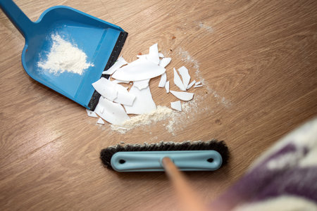 Sweeping up white plate shards with a brush into a dustpan, a scene of cleaning up after an accident, illustrating domestic order restoration