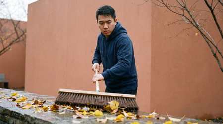 Focused young man cleaning wet autumn leaves with a broom in a courtyard during a rainy day, surrounded by bare tree branches.