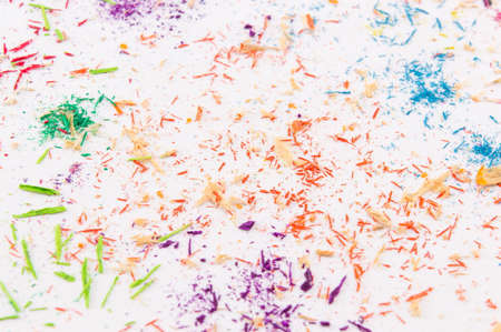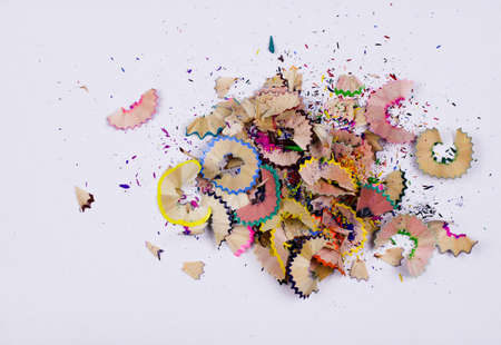 Sawdust from a sharpened colored pencils on the white background. top view. copyspace. Banner. art concept. Drawing hobby. template. mockup design. isolated object. Curly wooden trash. messy texture.