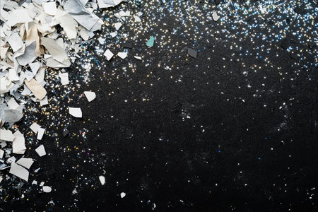 Captivating image of vivid glitter and confetti in various shapes, laying on a dark surface, perfect for representing celebrations, parties, and joyful occasions.