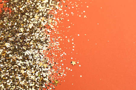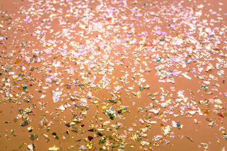Neon pearl confetti and sparkles background. Top view, flat lay. Copyspace for text. Bright and festive holiday background. For Christmas, New year, Mother's day