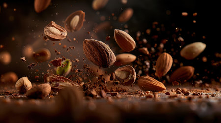 Almonds are captured in mid air, showcasing their natural texture and color against dark background. image conveys sense of motion and energy, highlighting beauty of these nuts