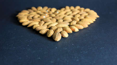 Almonds scattered on a black table. Almond is a healthy vegetarian protein nutritious food. Natural nuts snacks.