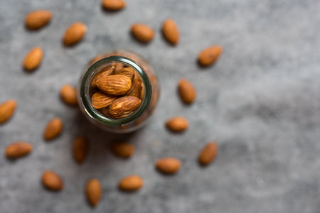 Directly above shot of almonds on gray background with copy space. unaltered, healthy food, snack, organic, nut and dried food.