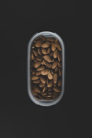Almonds nut on Table and in transparent box light colour background with space for text Selective Focus.