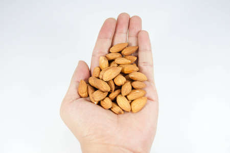 Macro shot of Woman hands holds whole almonds, a tasty and crunchy snack.