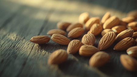 A close-up shot of raw almonds scattered on a wooden surface, highlighting their natural textures and rich brown color with soft lighting