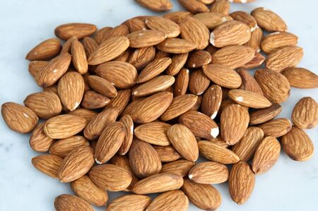 Healthy food for background image close up almond nuts. Texture on white grey table top view.
