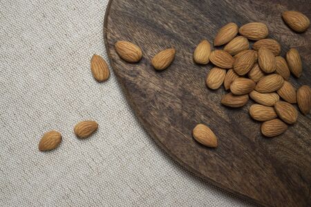 Almonds scattered on the wooden vintage table. Almond is a healthy vegetarian protein nutritious food. Almonds on rustic old wood