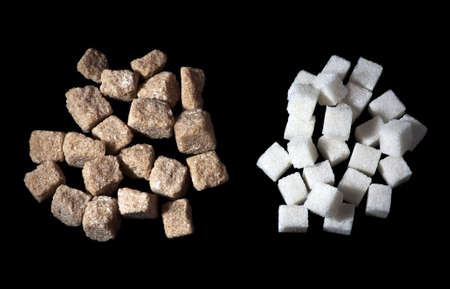 two heaps brown and white sugar isolated on a black background
