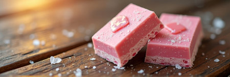 Close-up of pink chocolate bars with sea salt on wooden surface. That the image is generated using AI.