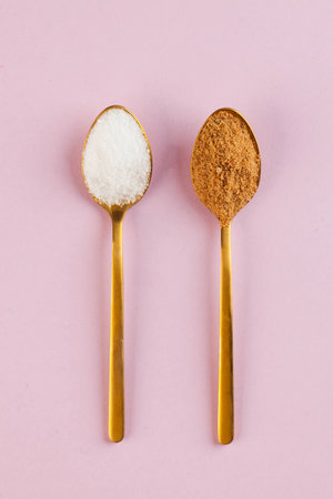 Variety of sugar white, brown pink fruit granulated, cubes and crystal over old texture iron background. Top view.