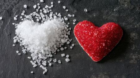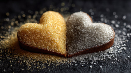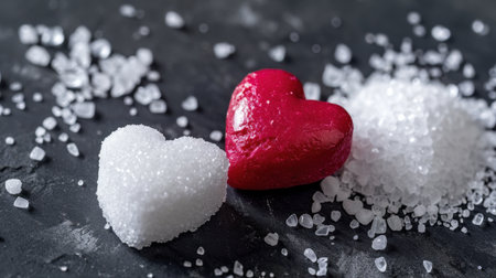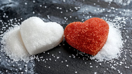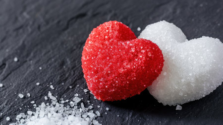 A captivating close-up of pink and white sugar shaped into hearts, creating a sweet contrast on a dark surface, perfect for themes of love and culinary art.