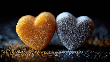 Two elegantly crafted hearts made of sugar rest on a dark surface, creating a romantic ambiance perfect for celebrations and culinary art.
