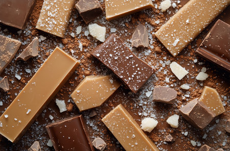 An assortment of chocolate pieces includes dark, milk, and caramel varieties. Sea salt and sugar crystals enhance the display, inviting indulgence and enjoyment in a dessert setting.