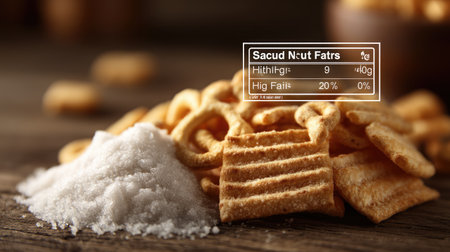 A close-up shot of a crispy snack mix piled on a rustic wooden table, featuring sea salt and detailed nutrition facts, inviting a healthy choice for snack lovers.