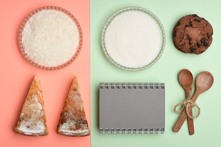 set of coconut and sugar with apple pies near chocolate chip cookies, recipe book or notepad and wooden spoons tied with twine on colorful pink and green background, copy space
