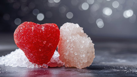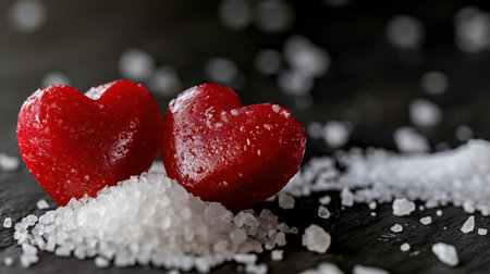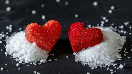 Delightful heart-shaped candies nestled in a bed of white sugar granules create a romantic atmosphere perfect for celebrations or sweet gestures.