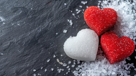 Close-up of vibrant red and white sugar hearts on a dark stone surface, evoking feelings of love and sweetness, perfect for romantic themes and culinary delights.