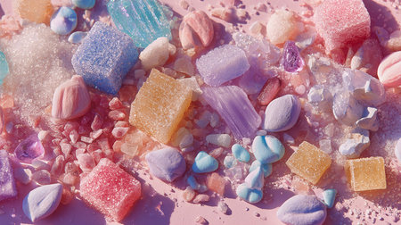Bright and colorful gummy candies coated with sparkling sugar sit dramatically against a dark background, evoking feelings of joy and indulgence perfect for any celebration.