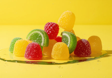 Glistening, sugar coated fruit gummies in vibrant red, yellow, and green colors, piled on a wet reflective surface against a bright yellow background. sweet confectionery snack.