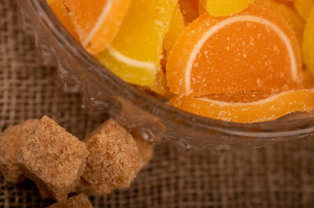 Multicolored shaped marmalade lemon slices in a glass vase and pieces of brown cane sugar, close-up, selective focus
