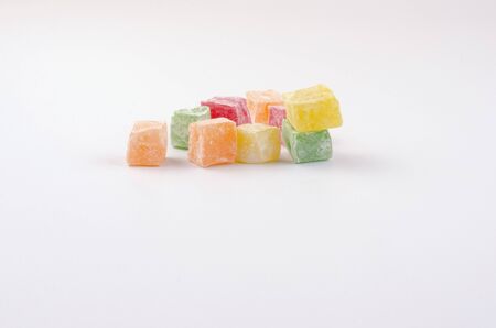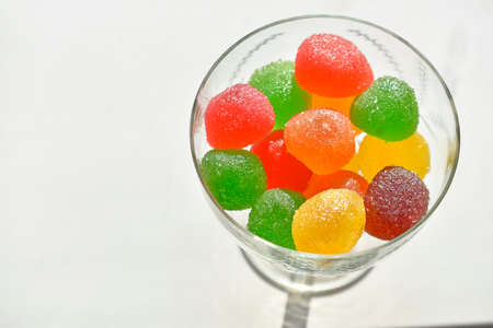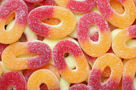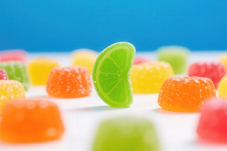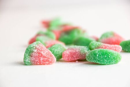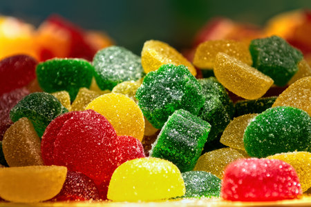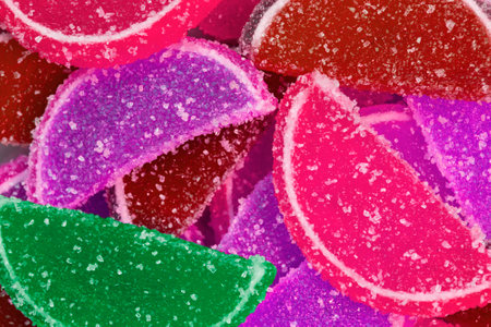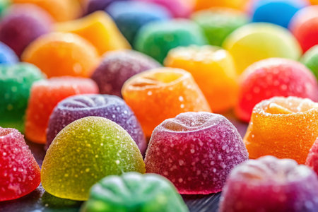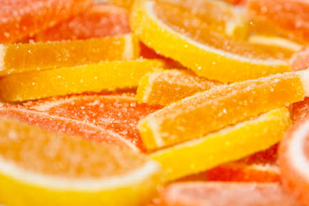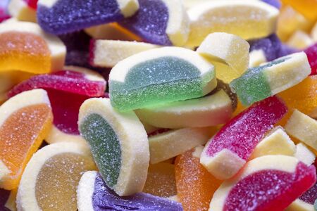 Colorful fruit jelly candies close-up macro photography with soft focus