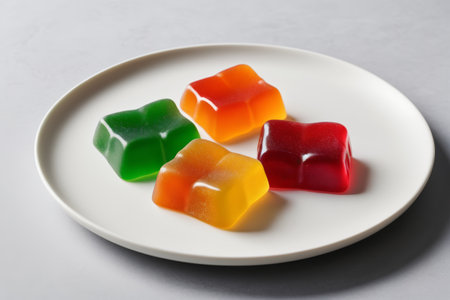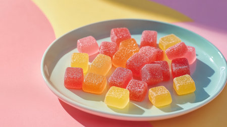 A vibrant assortment of colorful gelatin candy arranged on a plate, set against a bright background, perfect for parties and cheerful gatherings.