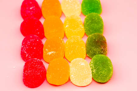 colorful marmalade candies laid out in rows of color on a pink background. High quality photo