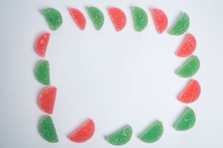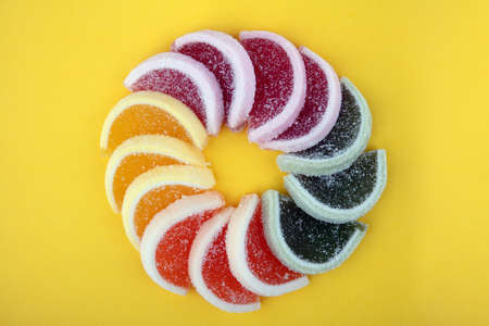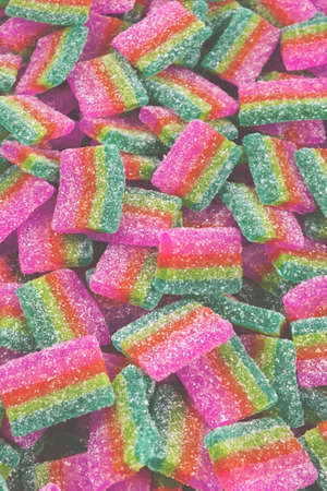 Rainbow juicy gummy candies background. top view. Jelly sweets.