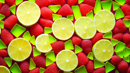 A close-up of a vibrant assortment of fresh fruits and colorful jelly candies.