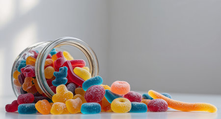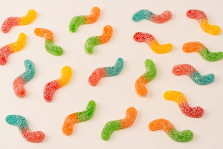 A playful arrangement of multicolored gummy candies on a white surface, capturing the sweet and sugary appeal of these popular treats.