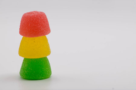 Close-up of colorful jelly candies on a white background, highlighting their bright and sugary appearance. Perfect for themes of sweets, fun, and treats.