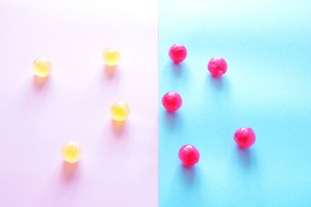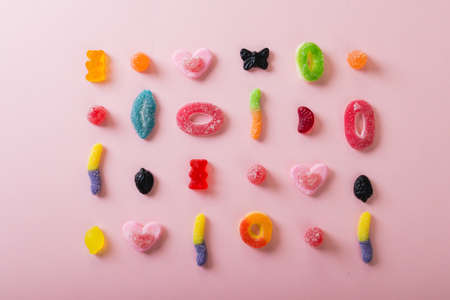 Directly above view of differently shaped multi colored sugar candies arranged on pink background. unaltered, unhealthy eating and sweet food concept.