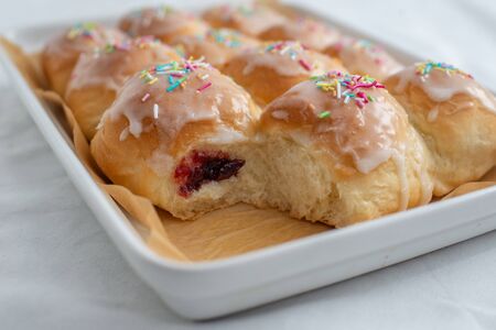 Fresh baked sweet fillded buns with sugar powder for sale at small cafe