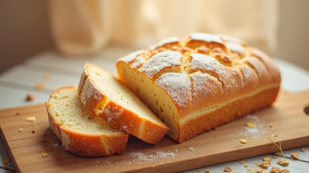 Freshly baked sliced bread loaf on a wooden cutting board with soft sunlight. That the image is generated using AI.