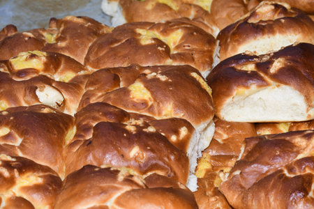 Sweet bread, easter tsoureki cozonac background, top view. Braided brioche, festive traditional challah closeup view