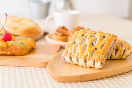 Top view of dessert table Bakery. Baking Bakery with berry jam, almond and poppy seeds. Bread, egg dessert, buns and croissants.