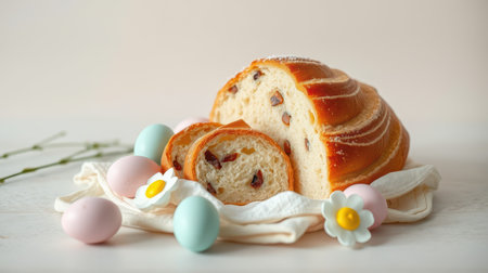 Deliciously baked sweet bread with chocolate pieces and colorful eggs for a festive spring celebration