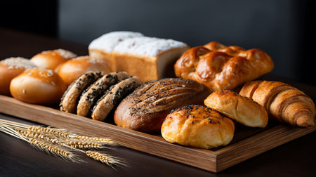A wooden tray filled with an assortment of freshly baked bread and pastries