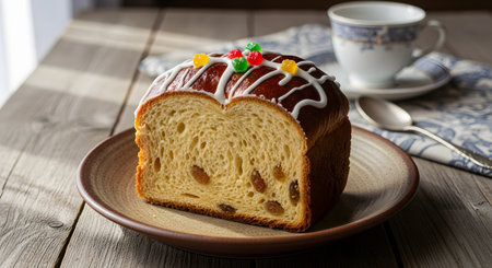 A thick slice of sweet bread, possibly Easter bread or a variation of panettone, with raisins baked in. The top is decorated with white icing and colorful candied fruit, served on a rustic plate on a wooden table.